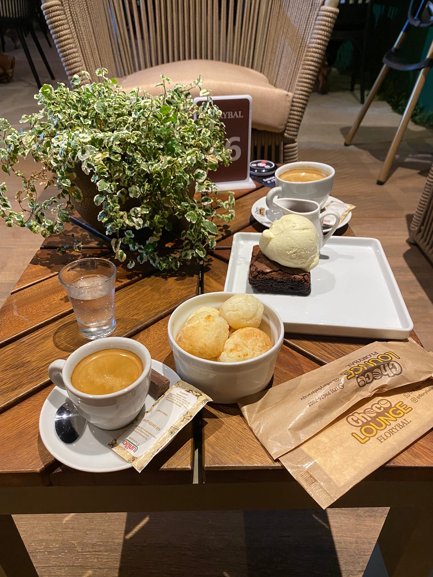 Pedimos o brownie com sorvete, uma porção de pão de queijo mineiro tradicional, um espresso romano e um espresso normalzinho.